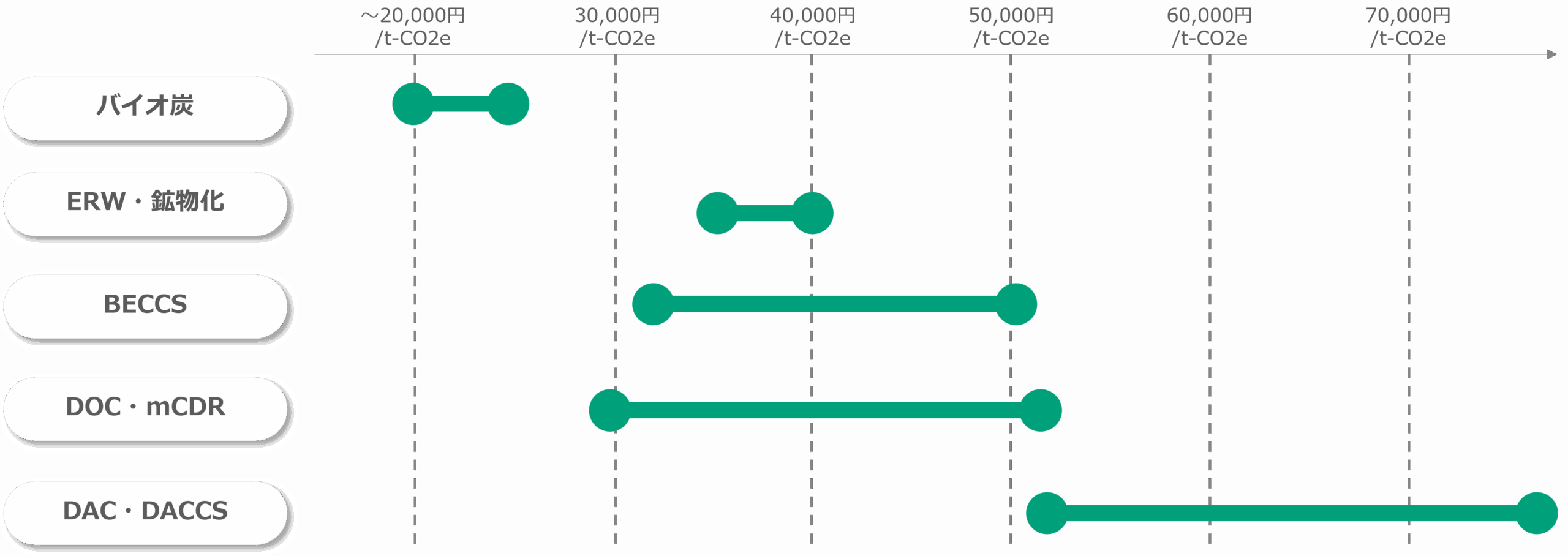 2030年時点の、主要なCDR方法論の価格予測は下図の通り20,000円~70,000円超まで大きな開きがあります。バイオ炭が最も安く20,000円代前半、DAC・DACCSが最も高く最低でも50,000円超と予測されています。