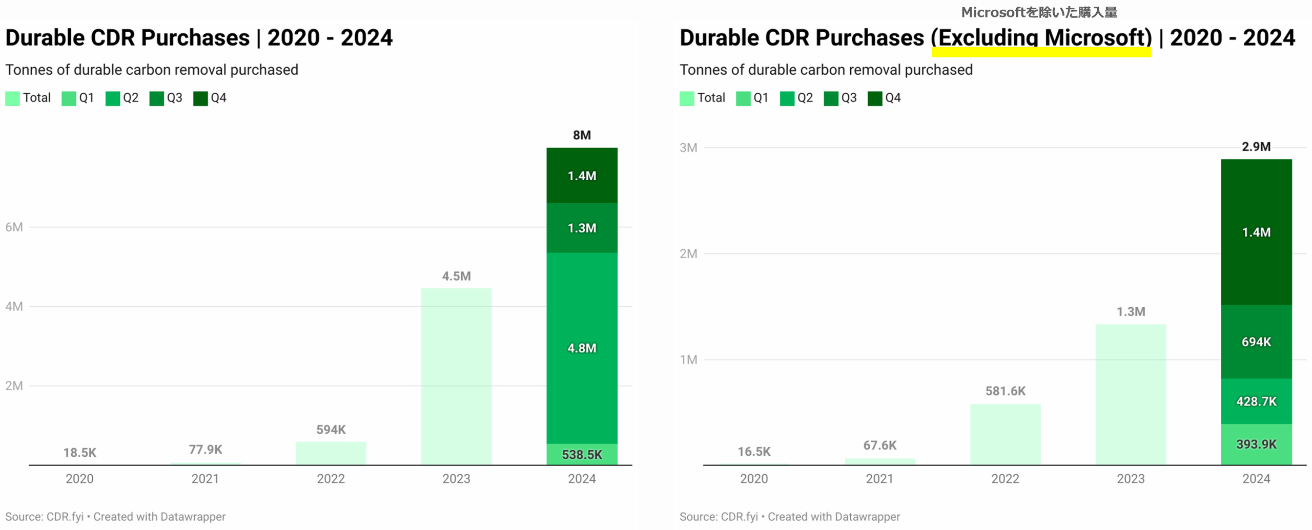 CDR市場としては、Microsoftを除いた場合でも、2023年に130万トン、2024年には290万トンと、220%の市場成長を遂げています。