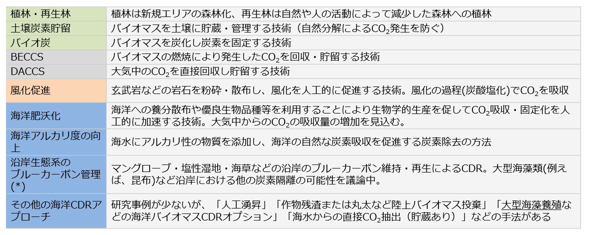 CDRは大きく、「自然プロセスを人為的に加速させる手法」と「工学的プロセス」に分けられます。前者は、植林や海洋のCO2吸収を促進する技術、風化促進など。後者はDACCSとBECCSを指します。