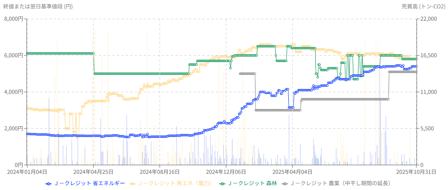 これまでOTC(Over The Counter,相対取引)が中心だったJクレジット市場に、東京証券取引所カーボン・クレジット市場が開設され、価格の透明性が向上したことも一定影響があると推察されます。